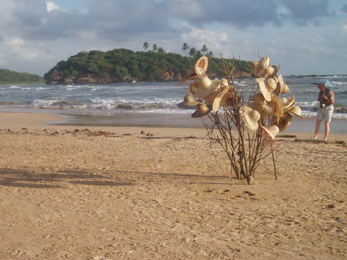 A hat seller's display of goods on a Sri Lankan beach