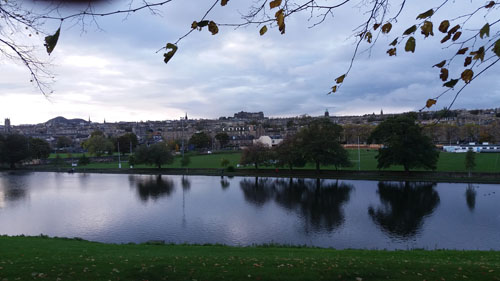 Leighton: early morning, picture framed by the leaves and with reflections in the water.