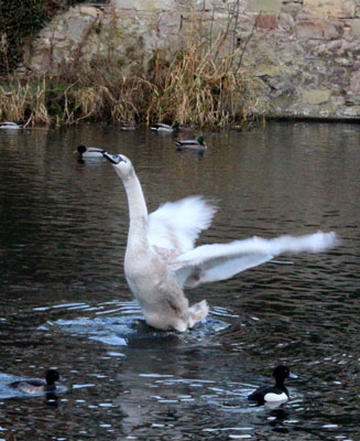 Bob took himself to Craiglockhart Pond to photograph the birds. The pond was icy, the weather was clear and the pictures were beautiful. This is a classic swan pose.